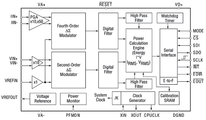 - 片内功能:能量,I*V,IRMS和VRMS能量/脉冲转换